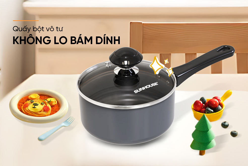 Nồi quấy bột chống dính Sunhouse SHG-MP14X được làm từ hợp kim nhôm quốc tế cao cấp, có độ dày 1.5mm, giúp truyền nhiệt nhanh, nấu ăn chín đều và tiết kiệm năng lượng.