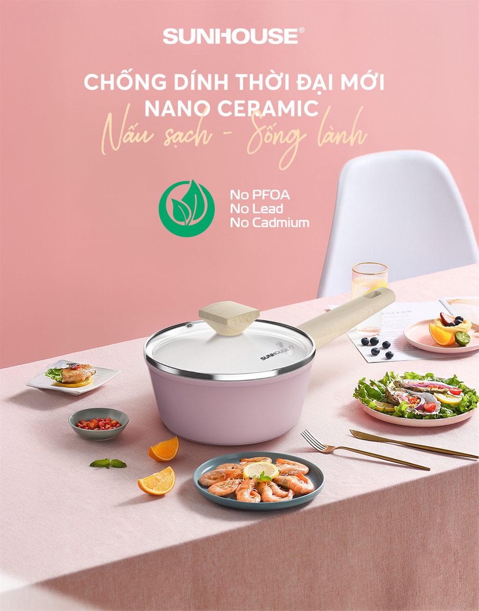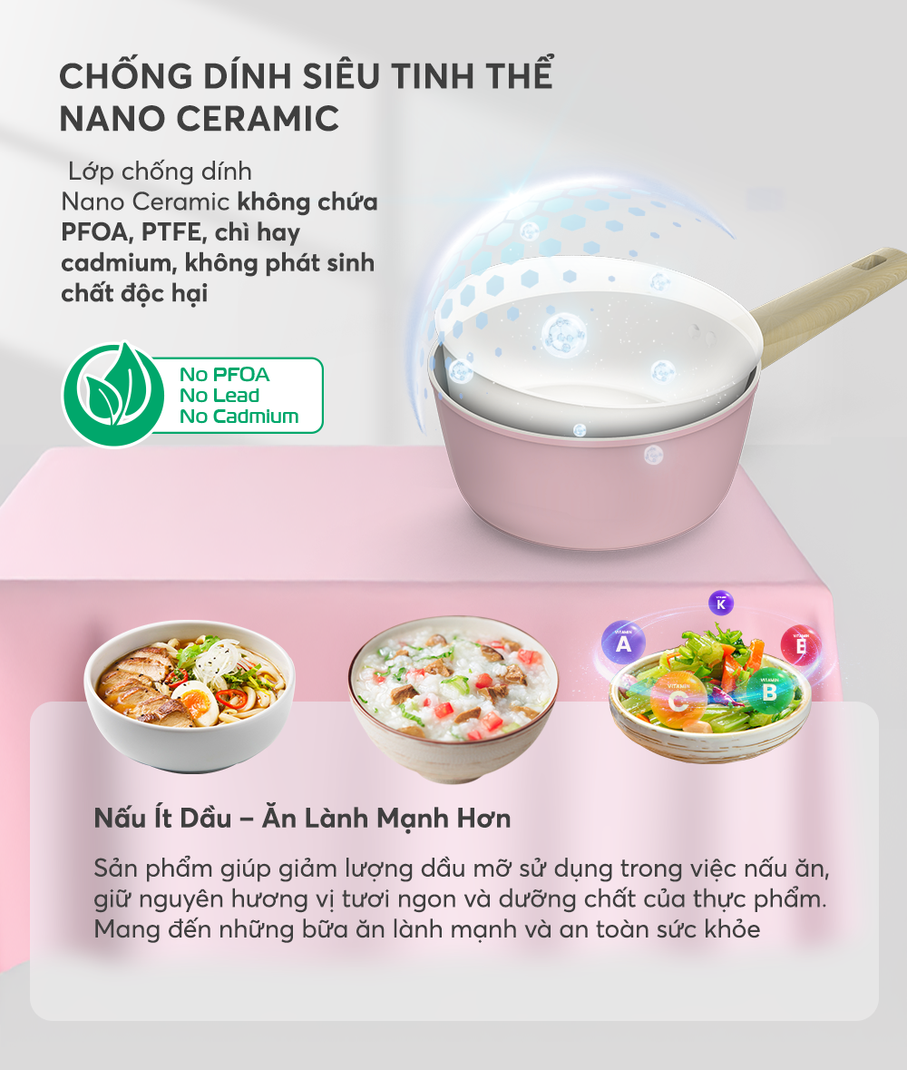 • Chống dính tinh thể Nano Ceramic – Bề mặt mịn hơn, bền bỉ hơn, chiên xào dễ dàng & vệ sinh nhanh chóng.