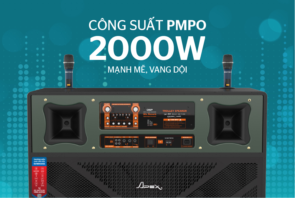 Loa APA3585 có công suất PMPO lên tới 2000W, được trang bị 2 loa Treble, 2 loa Bass 50 mang lại âm thanh trung thực, rõ ràng, sống động. Loa kéo APEX thể hiện rõ từng âm sắc một cách vang dội, mạnh mẽ mà vẫn giữ được chất lượng âm thanh nguyên bản, cho cuộc vui thêm hào hứng, sôi động.