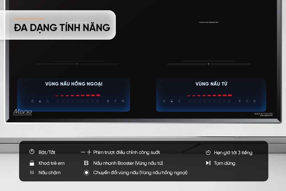 Được trang bị 2 vùng nấu: Từ và hồng ngoại, Bếp đôi điện từ hồng ngoại Sunhouse Mama MMB82281-TMT là sự lựa chọn tối ưu để đáp ứng các nhu cầu nấu nướng đa dạng, phù hợp với nhiều loại nồi chảo khác nhau. Với thiết kế sang trọng cùng mặt kính Ultra Vitro Ceramic chịu lực, chịu nhiệt vượt trội cùng 2 chế độ nấu nhanh - nấu chậm thông minh, bảng điều khiển cảm ứng nhạy bén, sản phẩm đảm bảo an toàn và tiết kiệm điện năng tối ưu mỗi lần nấu nướng.