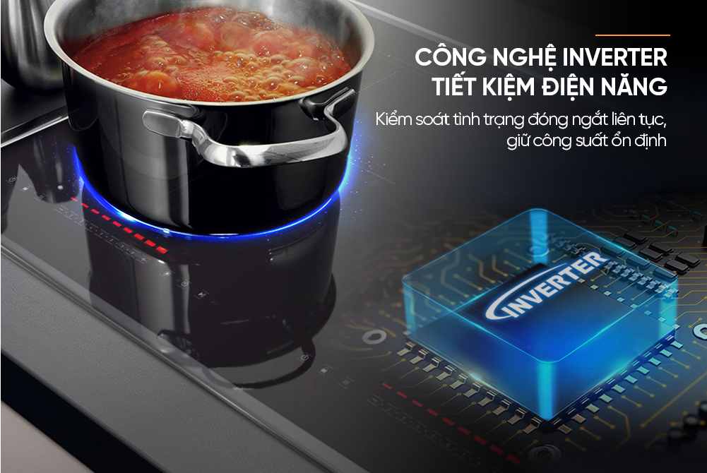 Công nghệ Inverter giúp tối ưu khả năng tiết kiệm điện và nâng cao hiệu suất hoạt động của bếp. Nhờ khả năng duy trì công suất ổn định và điều chỉnh điện năng linh hoạt, bếp hạn chế tình trạng đóng ngắt nhiệt liên tục như các dòng bếp từ thông thường. Nhờ đó, thiết bị vận hành êm ái, bền bỉ và mang lại trải nghiệm nấu nướng tiện lợi hơn cho gia đình.