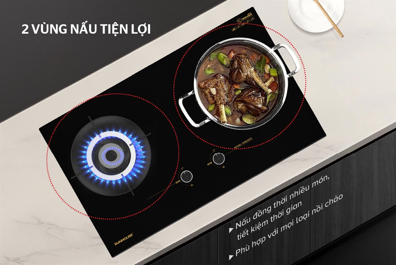 • 2 vùng nấu rộng rãi, phù hợp mọi loại nồi chảo