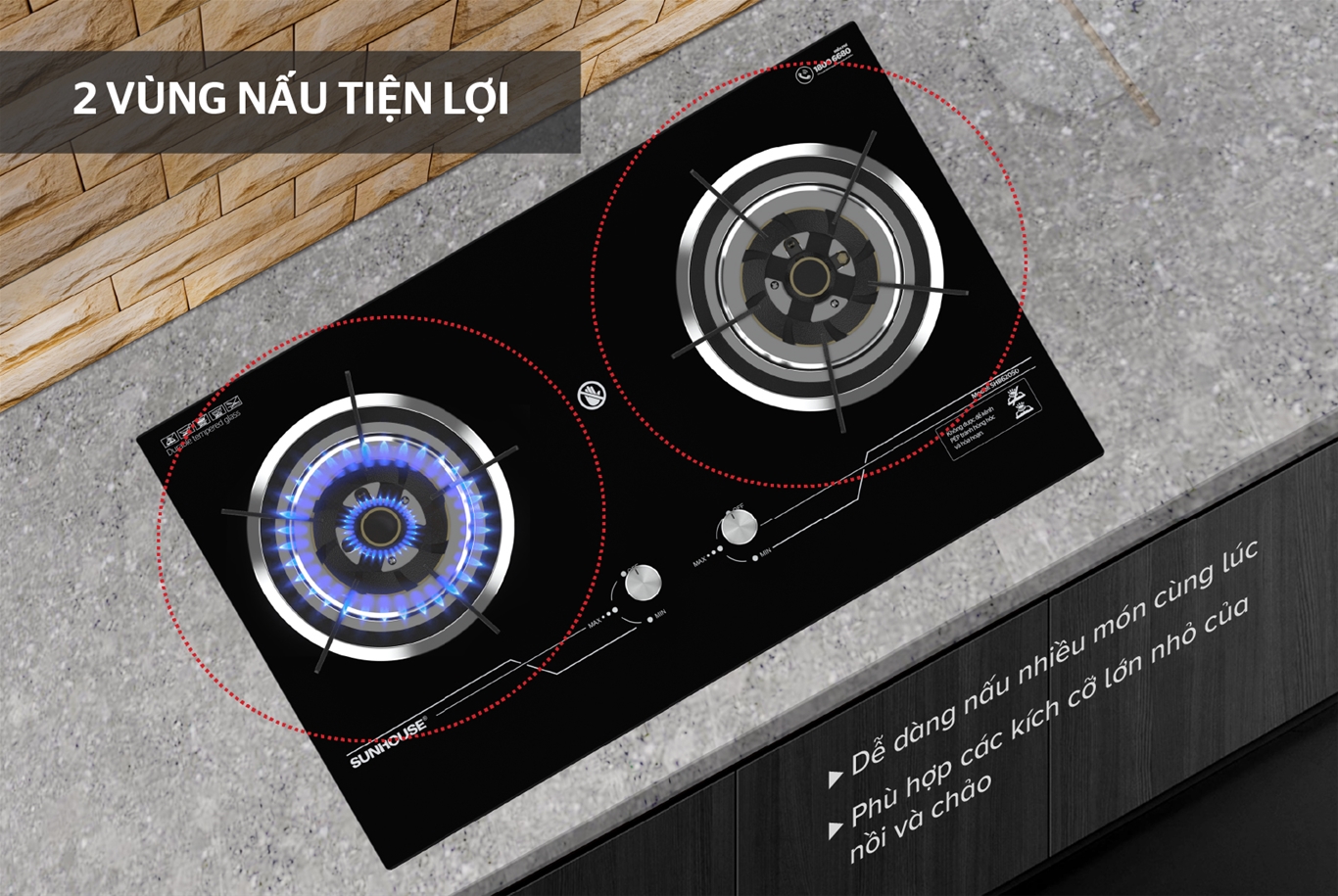 • 2 vùng nấu rộng rãi, phù hợp mọi loại nồi chảo