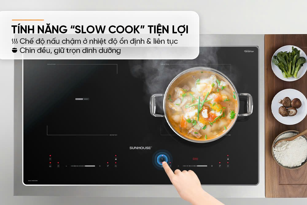 Với chế độ Slow Cook của bếp đôi điện từ Sunhouse SHB52026BN, nhiệt được duy trì ổn định, hạn chế tối đa tình trạng ngắt quãng như ở một số dòng bếp thông thường. Thức ăn vì thế được chín đều từ ngoài vào trong, giữ được độ mềm và chất dinh dưỡng tối đa, rất thích hợp cho những món cần nấu kỹ như ninh, hầm hay súp.