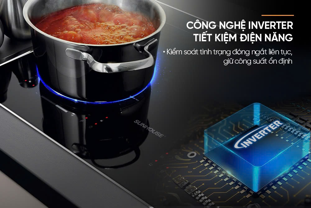 Bếp đôi điện từ Sunhouse SHB52026BN được trang bị công nghệ Inverter hiện đại, cho khả năng duy trì công suất ổn định trong suốt quá trình nấu nướng, đồng thời tối ưu mức tiêu thụ điện năng. Bếp vận hành hiệu quả, tiết kiệm điện tối ưu đồng thời giảm thiểu mọi rủi ro chập điện, kéo dài tuổi thọ sản phẩm. Không chỉ vậy, bếp còn hoạt động êm ái, giảm thiểu tiếng ồn, mang đến không gian nấu nướng yên tĩnh và dễ chịu hơn.