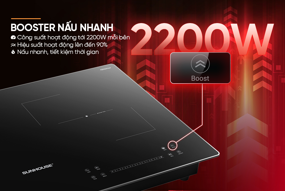 Khi chọn chức năng Booster, công suất của bếp sẽ được gia tăng lên tối đa giúp rút ngắn tới 50% thời gian nấu. Với chế độ ưu việt này, bạn có thể đun sôi 1 lít nước chỉ trong vòng từ 2-3 phút thay vì 5-7 phút khi nấu bằng bếp gas thông thường. Ngoài ra, bạn có thể tận dụng chức năng Booster để xào rau củ, thịt bò… vì nó khiến cho nguyên liệu chín nhanh hơn đồng thời giữ trọn được dưỡng chất cũng như hương thơm vốn có của thức ăn.