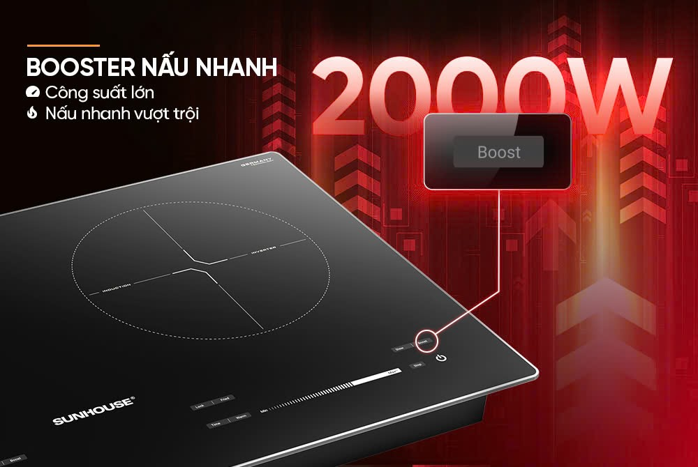 Chế độ nấu nhanh Booster giúp gia nhiệt nhanh chóng, tăng công suất lên mức cao nhất (2000W) trong thời gian ngắn từ đó tiết kiệm tối đa thời gian nấu nướng và thao tác nhanh gọn hơn trong bếp.