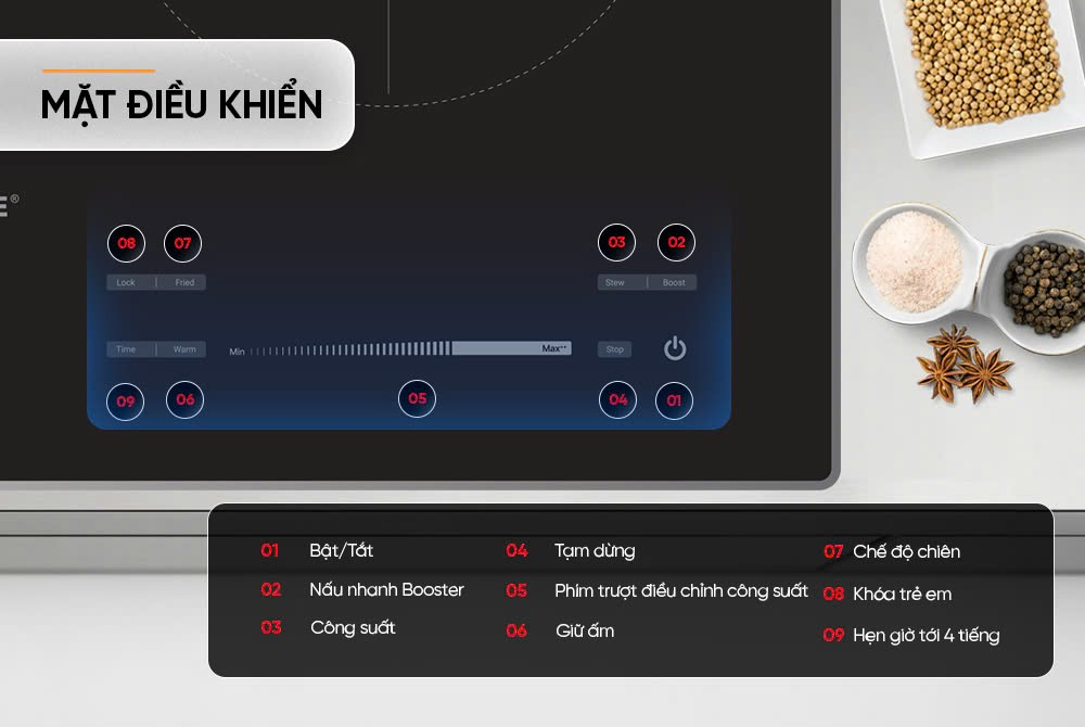 Cảnh báo/ngắt chống tràn: Khi nước tràn ra mặt kính, đặc biệt tại khu vực bảng điều khiển, bếp sẽ tự động ngắt để đảm bảo an toàn và hạn chế hư hỏng thiết bị.