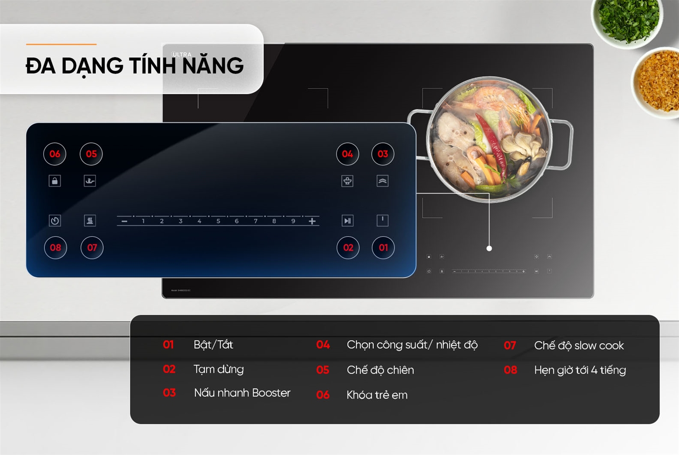 Nhằm nâng cao trải nghiệm sử dụng, bếp còn được tích hợp nhiều chế độ nấu nướng tiện lợi như chế độ chiên, xào, nấu nhanh… Đặc biệt, tính năng “SLOW COOK” – chế độ nấu chậm ở nhiệt độ thấp và ổn định trong suốt quá trình nấu, không bị đóng ngắt liên tục như các dòng bếp từ thông thường, giúp kiểm soát và đảm bảo nhiệt độ luôn chính xác. Điều này rất quan trọng đối với những món ăn cần nhiệt độ thấp như ninh, hầm, kho… và tạo hương vị mà không bị chín quá hoặc cháy, chính vì vậy món ăn giữ được hàm lượng chất dinh dưỡng cao, gần như là nguyên vẹn.