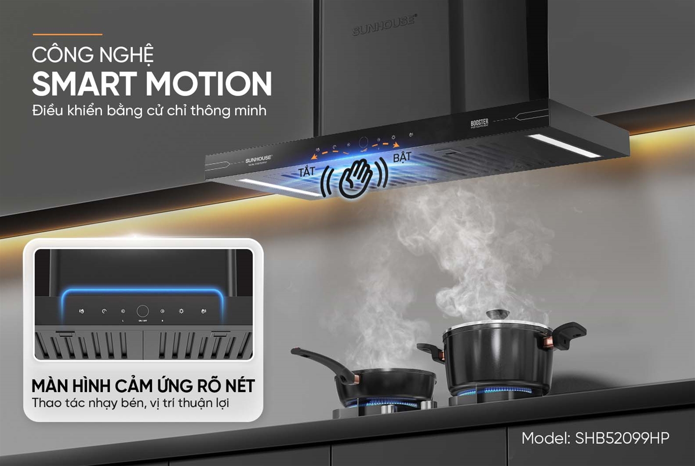Máy hút mùi SUNHOUSE SHB52099HP được trang bị công nghệ Smart Motion, cho phép điều khiển bằng cử chỉ mà không cần chạm trực tiếp. Chỉ với một cái vẫy tay, người dùng có thể bật/tắt máy hoặc điều chỉnh tốc độ hút theo nhu cầu, giúp bề mặt máy luôn sạch sẽ và hạn chế tiếp xúc trực tiếp, giảm nguy cơ vi khuẩn.