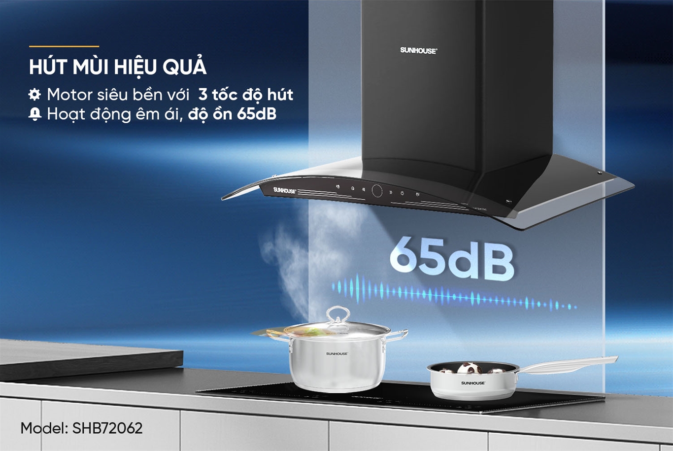 Máy hút mùi kính cong SUNHOUSE SHB72062 có công suất 750m³ /h, 3 tốc độ hút cho hiệu quả hút mùi tốt ưu lại tiết kiệm điện năng. Mùi dầu mỡ hay các mùi khó chịu khác trong quá trình nấu nướng sẽ nhanh chóng bị hút sạch, không ám mùi lên quần áo, các vật dụng nhà bếp hay các không gian liền kề khác (điển hình như thiết kế căn hộ chung cư).