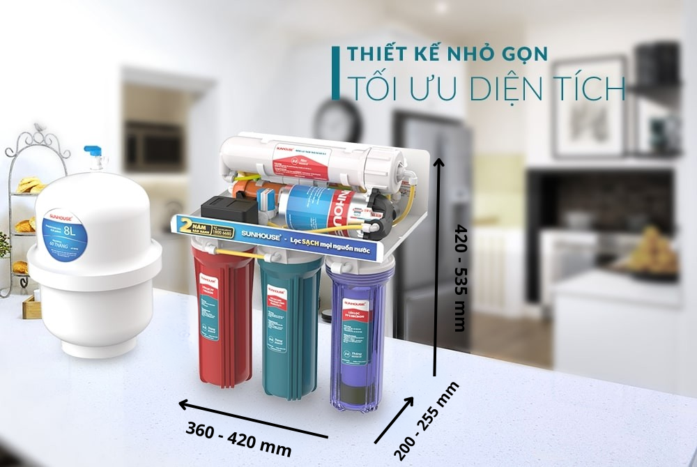 Chẳng hạn, đối với các sản phẩm máy lọc nước tại SUNHOUSE như mã SHA8859KV có chiều dài 365mm thì tương ứng với khoang tủ bếp có chiều dài từ 480mm hay mã SHA88512KV có chiều dài 384mm thì tương đương với tủ bếp dài 500mm,... Nếu tủ bếp nhỏ hơn kích thước này sẽ không để được bình áp hoặc không đủ không gian để sửa chữa lắp đặt.