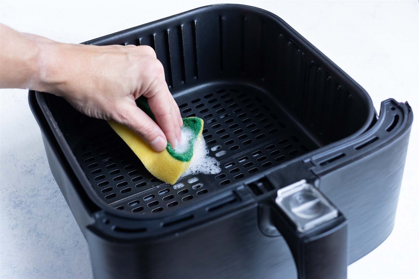 Rửa sạch giỏ chiên và khay hứng dầu bằng nước ấm và xà phòng.