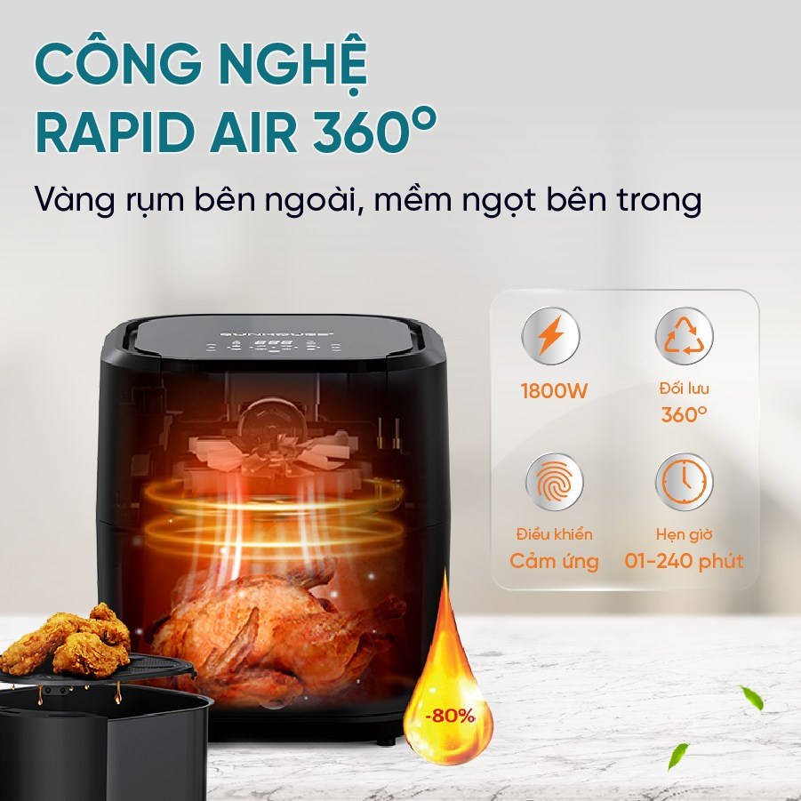Công nghệ Rapid Air giúp thực phẩm chín giòn bên ngoài, mềm bên trong mà không cần chiên qua dầu, giảm 80% chất béo.