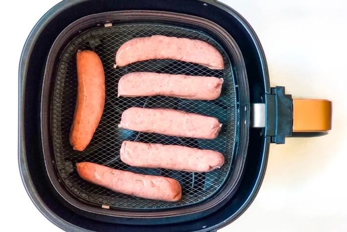 Nồi chiên không dầu cần được làm nóng trước khi nướng xúc xích khoảng 5 phút với nhiệt độ là 180 độ. Điều này giúp không khí trong nồi chiên không dầu được luân chuyển đều nhiệt và loại bỏ độ ẩm trong nồi đồng thời xúc xích sẽ nhanh chín hơn.